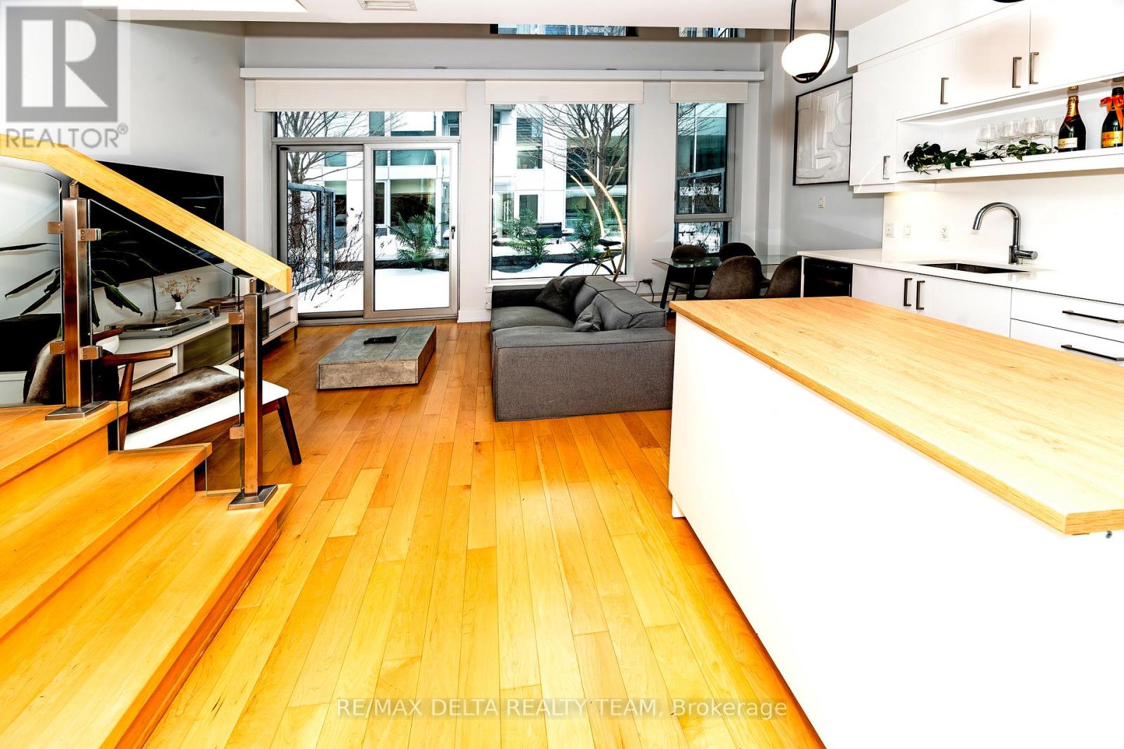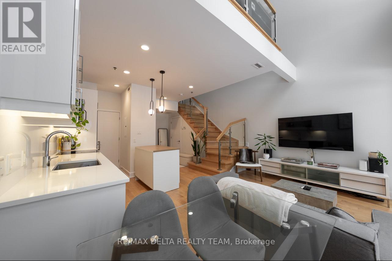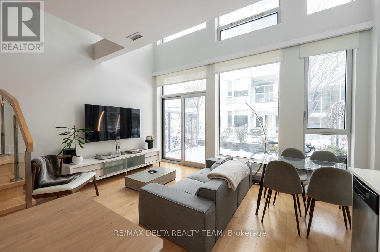 A rare offering in one of downtown Ottawa's most prestigious addresses. This exceptional residence at Tribeca Lofts by Claridge Homes showcases dramatic two-storey floor-to-ceiling windows, delivering a sophisticated loft aesthetic while bathing the interior in natural light and framing tranquil treed courtyard views. Designed for discerning urban living, this refined home offers a seamless blend of privacy and vibrancy in the heart of Canada's Capital. Ideally positioned moments from Parliament Hill, the Rideau Canal, ByWard Market, and Rideau Centre, the location is surrounded by Ottawa's finest restaurants, cafés, galleries, and cultural landmarks-all while enjoying the convenience of Farm Boy at your doorstep. A private walkout terrace opens directly to a lush, landscaped courtyard-an elegant extension of your living space and a serene retreat for outdoor entertaining. This unique ground-level access eliminates reliance on elevators and provides immediate access to the building's resort-style amenities, including an indoor pool, sauna, fully equipped fitness centre, resident lounge, boardroom, and courtyard BBQs.Additional luxury conveniences include guest suites for visitors, secure underground parking, a storage locker, and dedicated bicycle storage. Thoughtfully designed and impeccably located, this residence offers a rare opportunity to enjoy sophisticated city living with the tranquillity of a private enclave. An exceptional home for those who value luxury, lifestyle, and location. (id:28469)